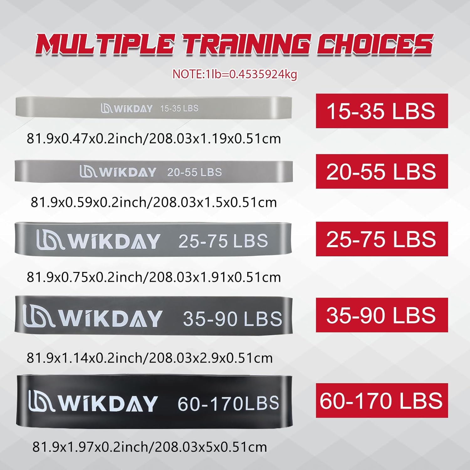 - Wide Applications: This professional exercise bands comes with 5 different levels of resistance with a new door anchor. #1Gray(15-35 lbs), #2Gray(20-55 lbs), #3Gray(25-75 lbs), #4Gray(35-90 lbs), Black(60-170 lbs). They are very suitable for beginners, fitness enthusiasts, athletes and other people