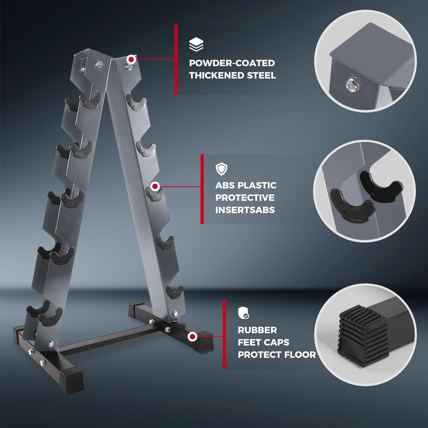 - Compact and Space-saving Rack: This weight rack features a heavy-duty construction with incredibly compact three-tiered design, allowing you to place it anywhere for your easy accessibility. Three angled horizontal shelves offer efficient barbell loading and retrieval. The solidly welded triangular base, with four non-skid feet, reinforces its overall structural stability. In addition to dumbbell storage, this rack can store kettlebells, medicine balls, yoga blocks, etc.