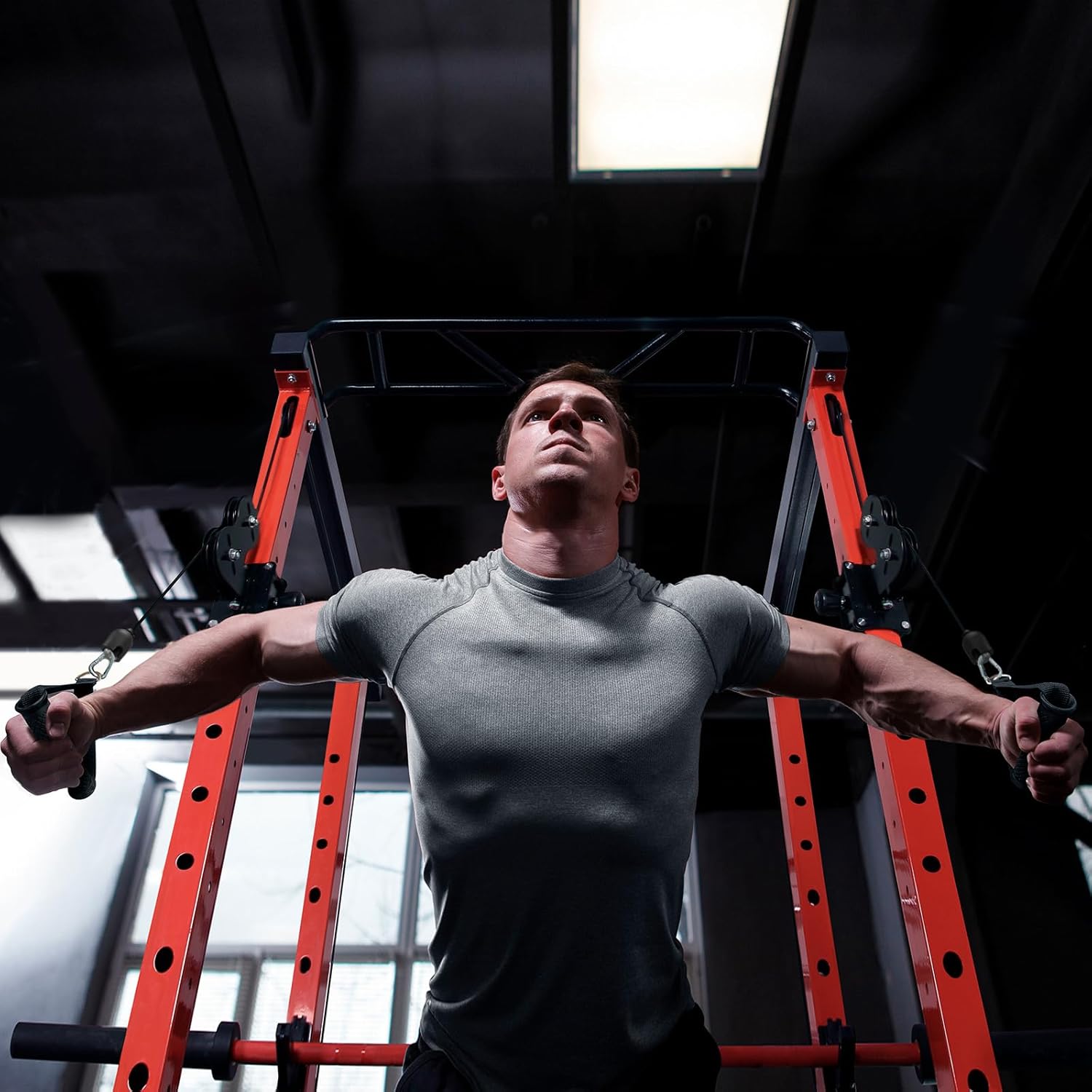- Free Utility Machine Attachments - The workout cage comes with a complete set of 20+ attachments, including 2 x J hooks, 2 x Safety Spotter Arms, 2 x Cable Grip Handles, 1 x Lat Pulldown Bar, 1 x Row Bar, 1 x Row Low Foot Tube, 1 x 360Β° Landmine, 4 x Plate Storage Pins, 2 x Weight Holers for the Cable System, 4 x band pegs, as well as 1 x Multi-grip Pull Up Bar. These attachments meet all your needs for various workouts