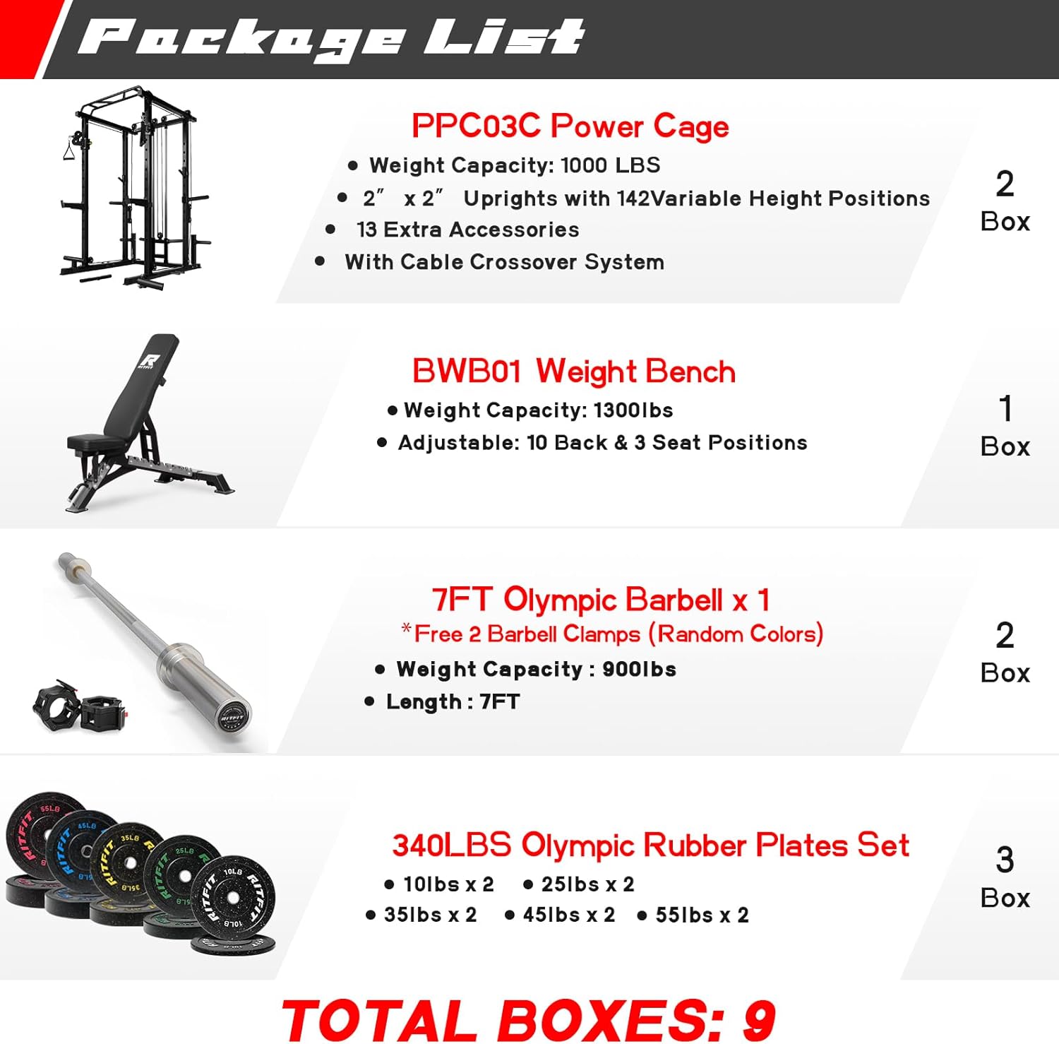 - What's in the package - RitFit PC-410CC Power Cage with Cable Crossover System *1; RitFit Adjustable Weight Bench *1; RitFit 2 inch Olympic Barbell *1; RitFit 340LBS Olympic Bumper Plates Set (10lbs *2, 25lbs *2, 35lbs *2, 45lbs *2,55lbs *2); Free Collars *2