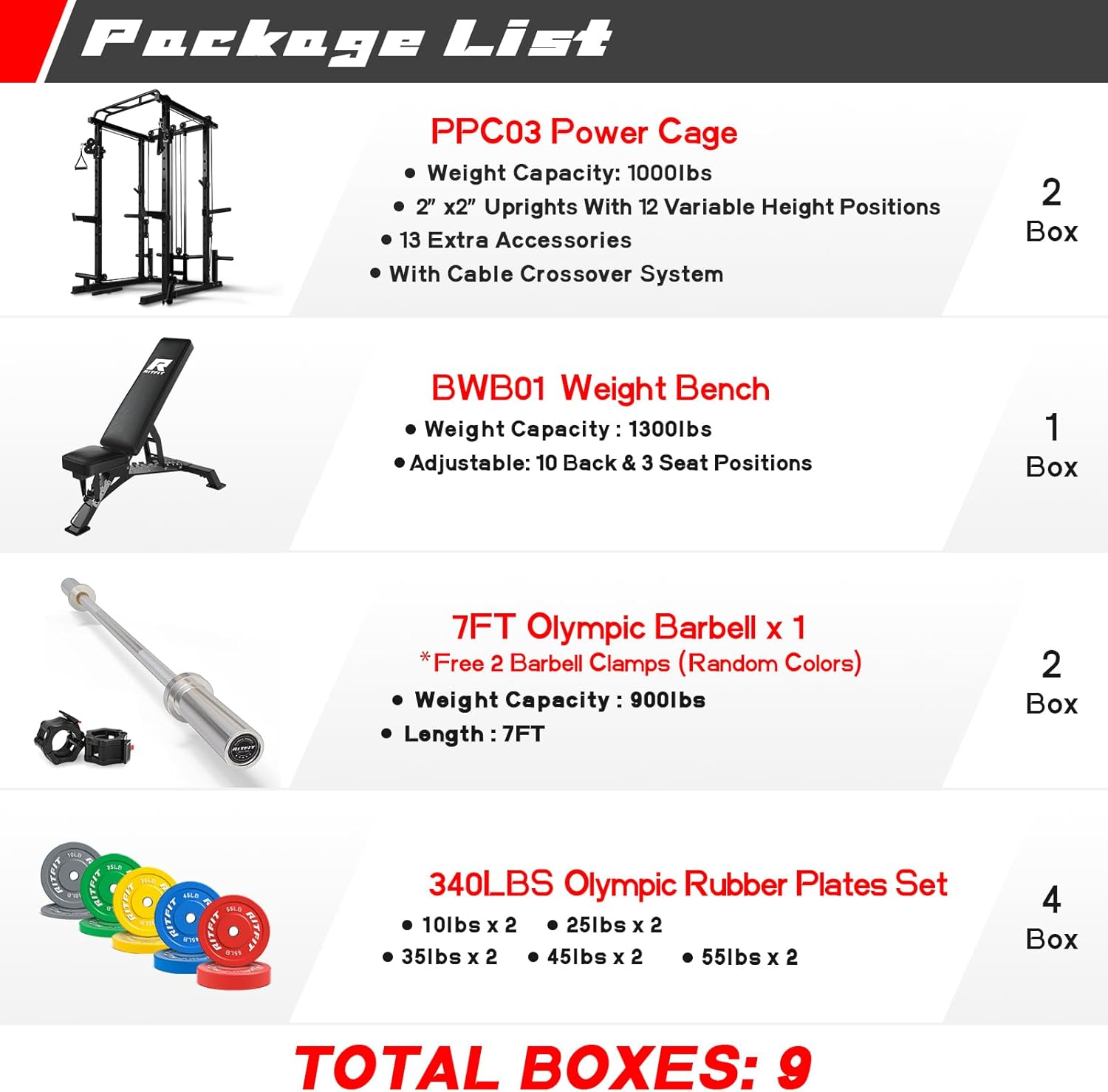 - What's in the package - RitFit PPC03 Power Cage with Cable Crossover System *1; RitFit Adjustable Weight Bench *1; RitFit 2 inch Olympic Barbell *1; RitFit 340LBS Colorful Olympic Bumper Plates Set (10lbs *2, 25lbs *2, 35lbs *2, 45lbs *2,55lbs *2); Free Collars *2