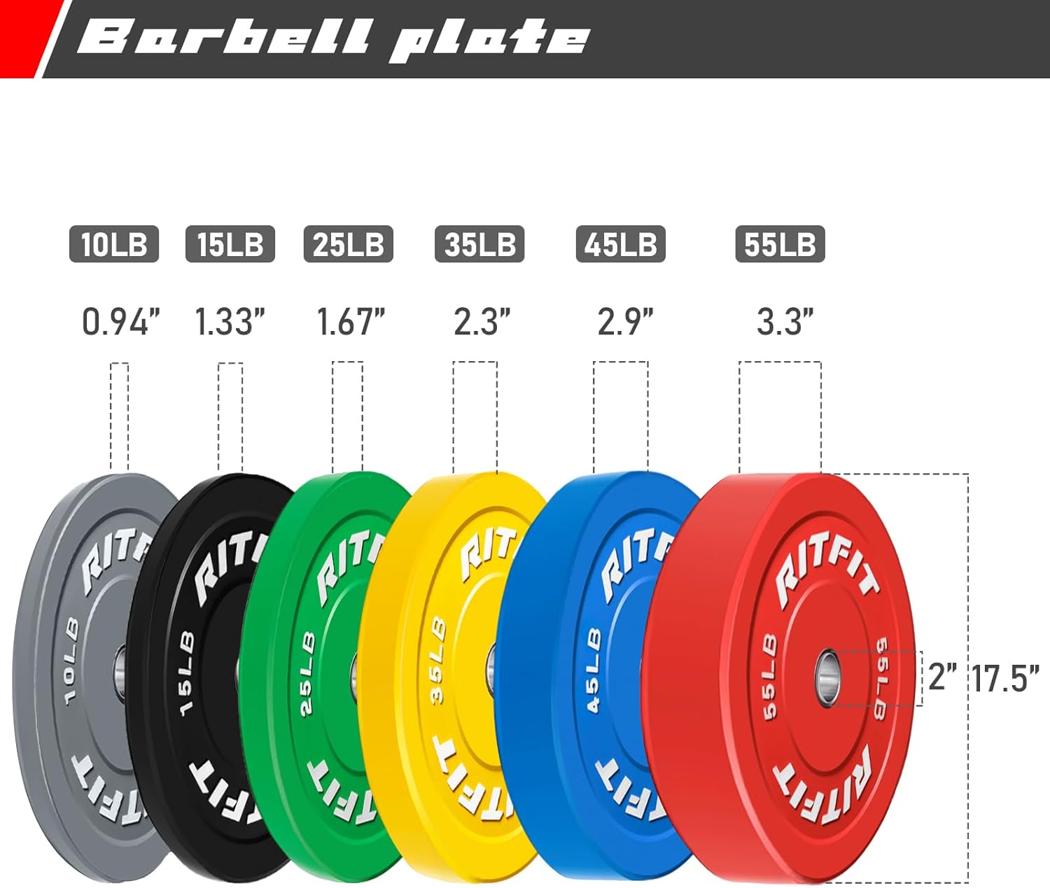 - What's in the package - RitFit PPC03 Power Cage with Cable Crossover System *1; RitFit Adjustable Weight Bench *1; RitFit 2 inch Olympic Barbell *1; RitFit 230LBS Colorful Olympic Bumper Plates Set (10lbs *2, 25lbs *2, 35lbs *2, 45lbs *2); Free Collars *2