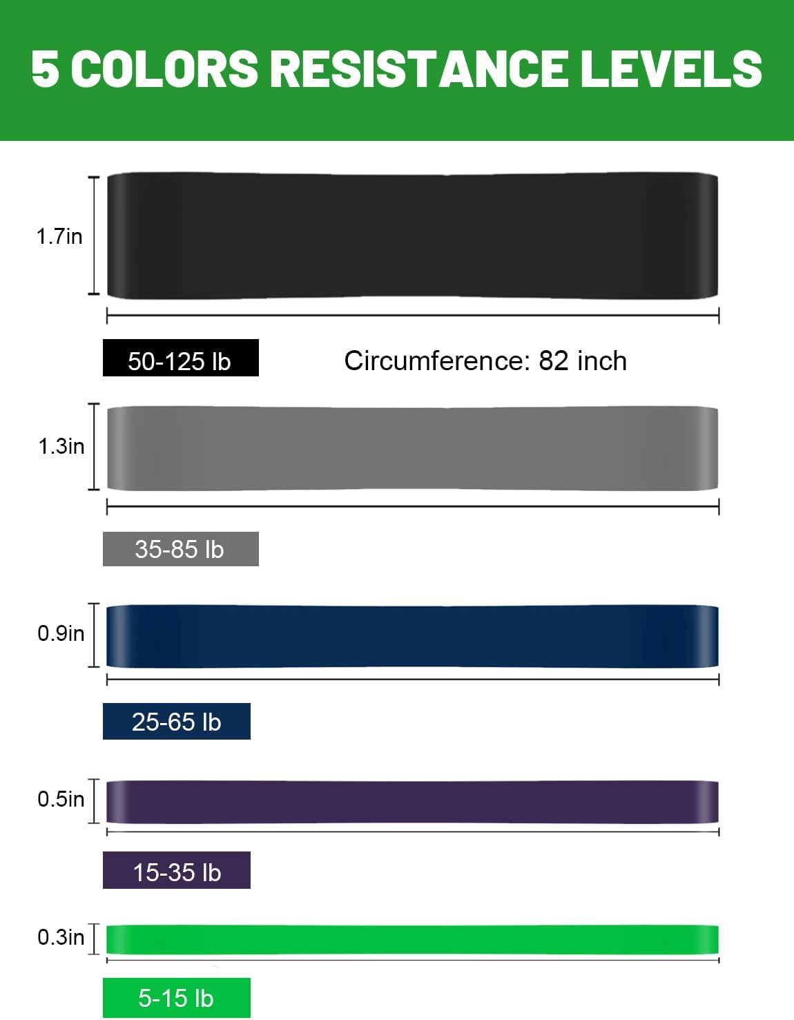 - Package Included: 5 pull up bands, 1 carrying bag and 1 workout guide. Resistance bands are 5-15 lbs, 15-35 lbs, 25-65 lbs, 35-85 lbs, 50-125 lbs. Use these exercise bands to perform rows, pulls, raises, and fly workout sets to exercise your arms, back, hips, legs, chest, and abdominal region