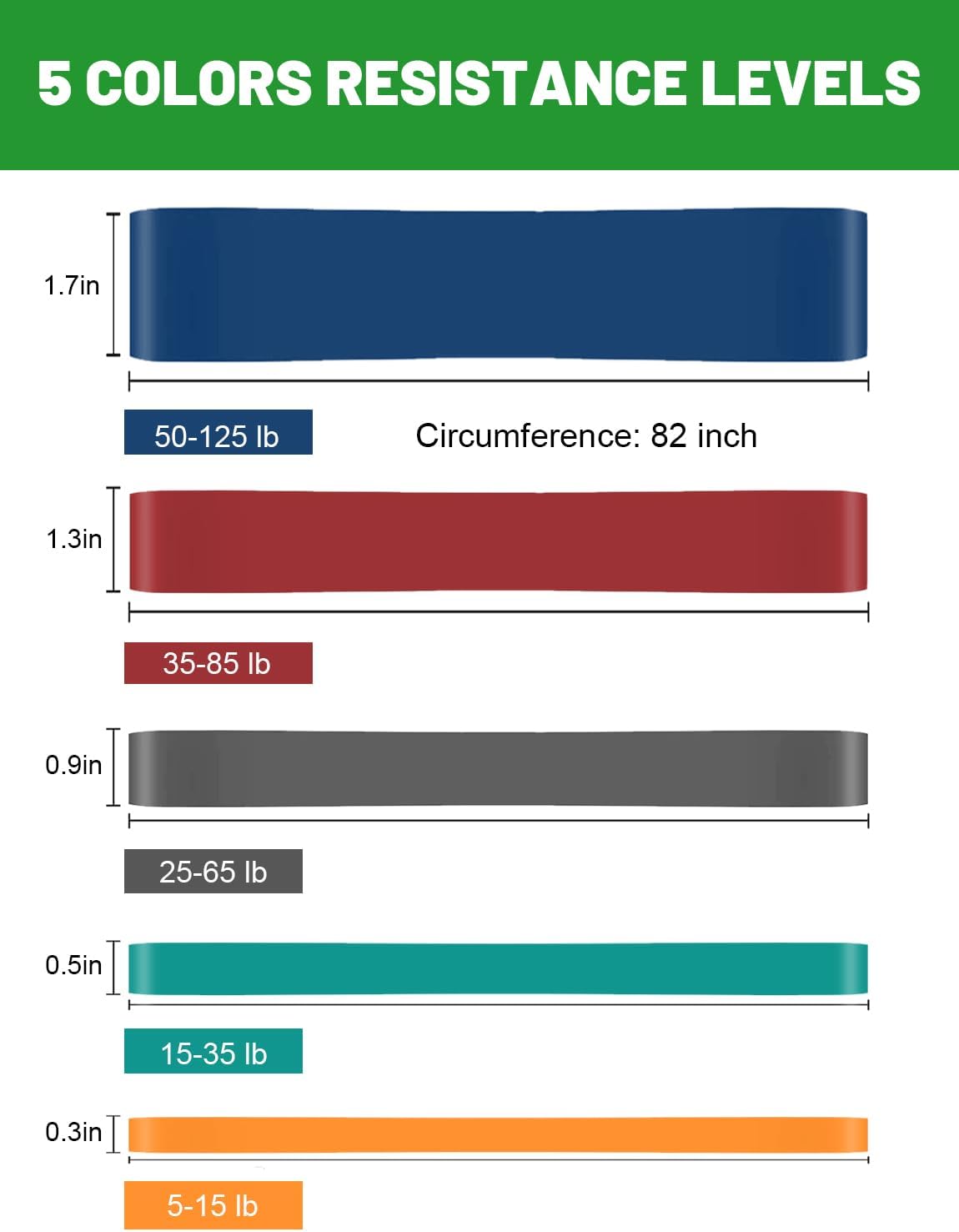 - Package Included: 5 pull up bands, 1 carrying bag and 1 workout guide. Resistance bands are 5-15 lbs, 15-35 lbs, 25-65 lbs, 35-85 lbs, 50-125 lbs. Use these exercise bands to perform rows, pulls, raises, and fly workout sets to exercise your arms, back, hips, legs, chest, and abdominal region