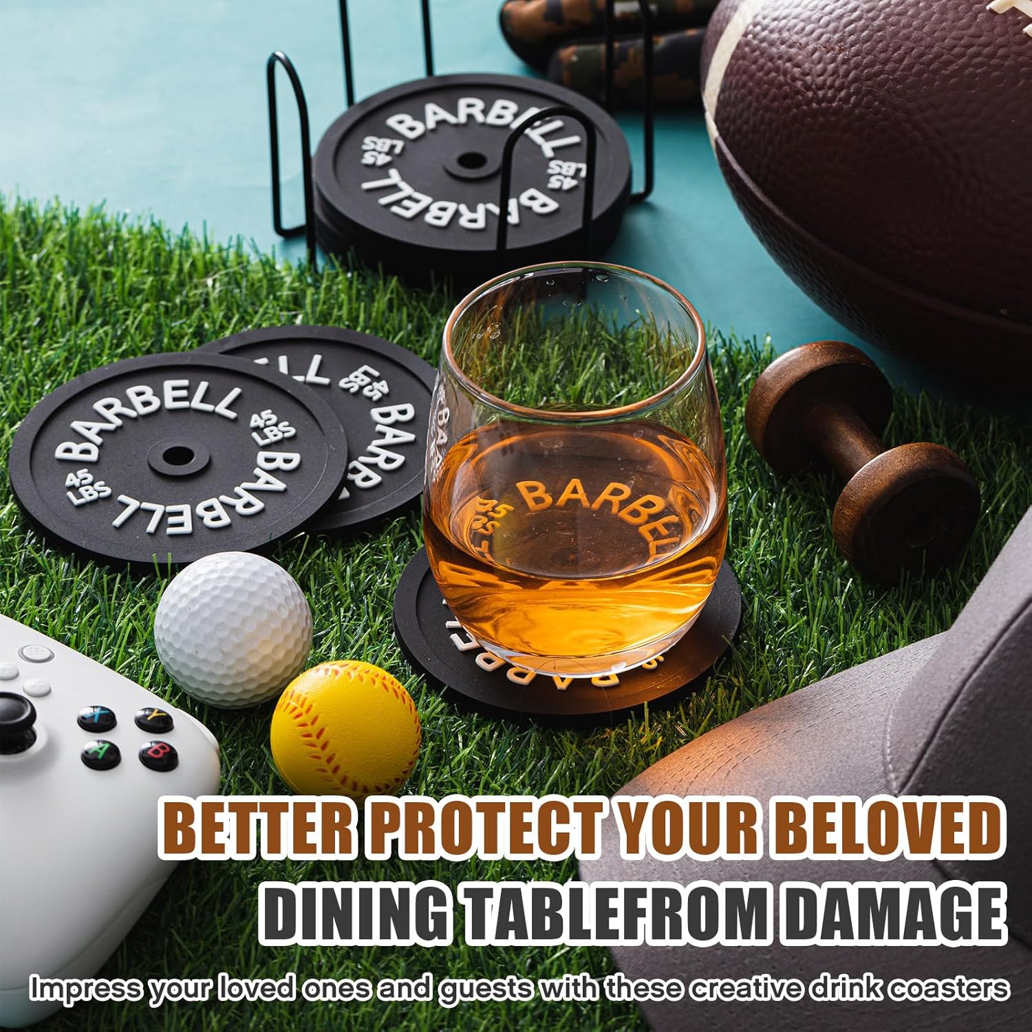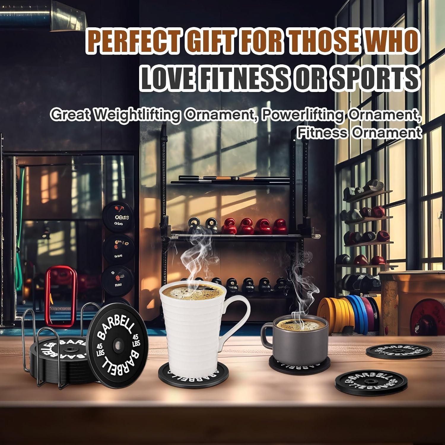 - Eye Catching And Inventive Design: the barbell coasters with astonishing gym inspired pattern enhances the aesthetics of your living space, the regular coaster design has been revamped with an ingenious barbell plate design, which is a nice but perfect gym decoration