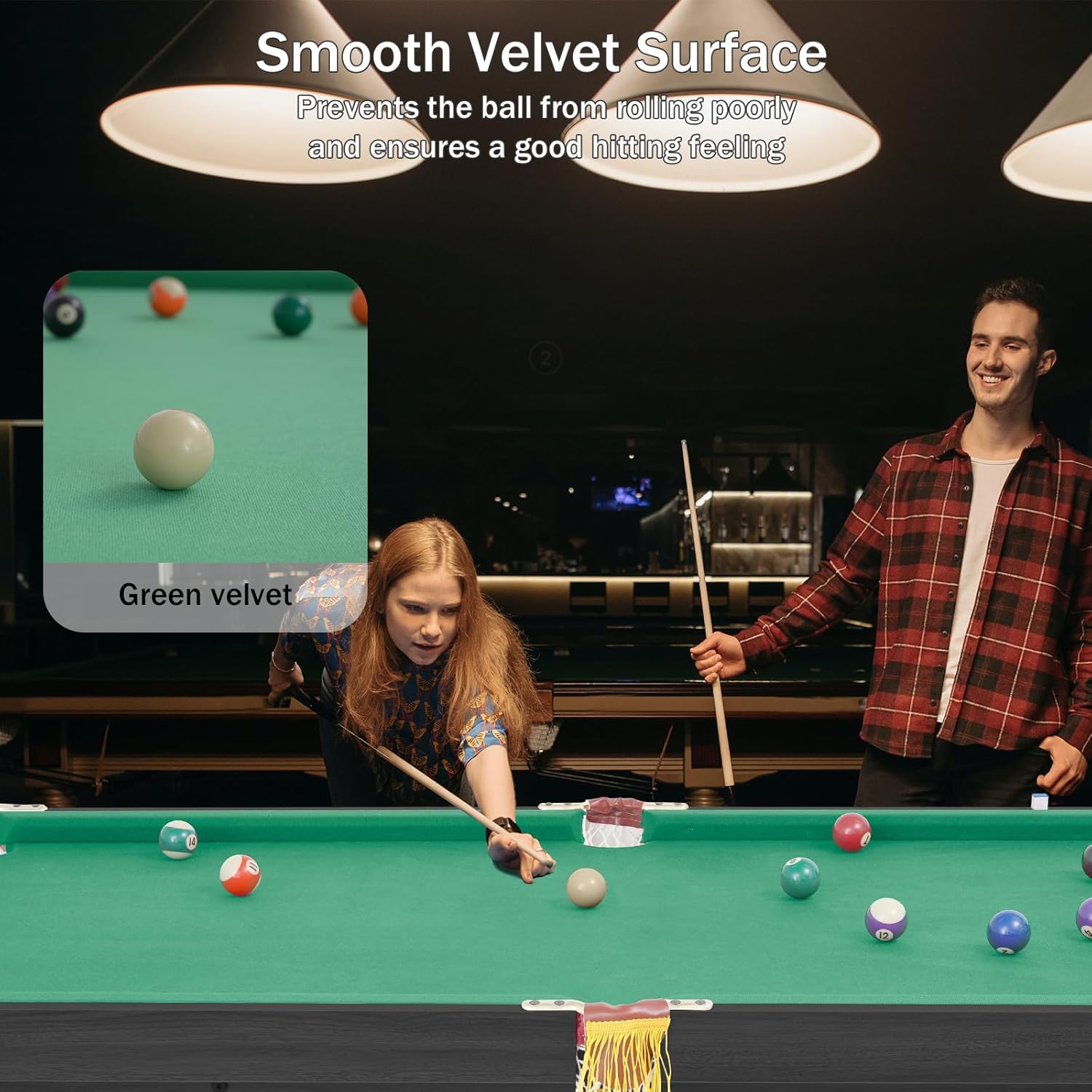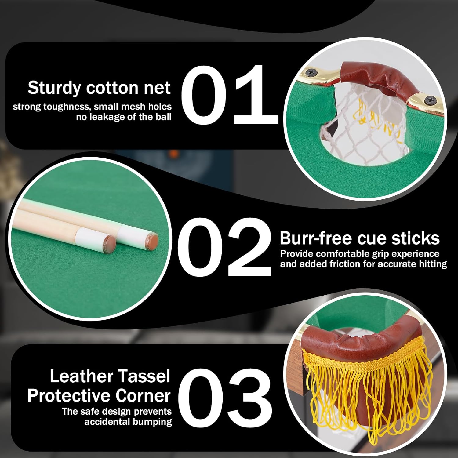 - 【SOPHISTICATED DESIGN】Our billiard table is very realistic, the surface is made of high-quality velvet cloth, delicate and smooth, good hitting feeling, high quality and durable mesh bag, strong toughness, small mesh holes, no leakage of the ball, leather pocket-proof flying ball design, giving you the best gaming experience!