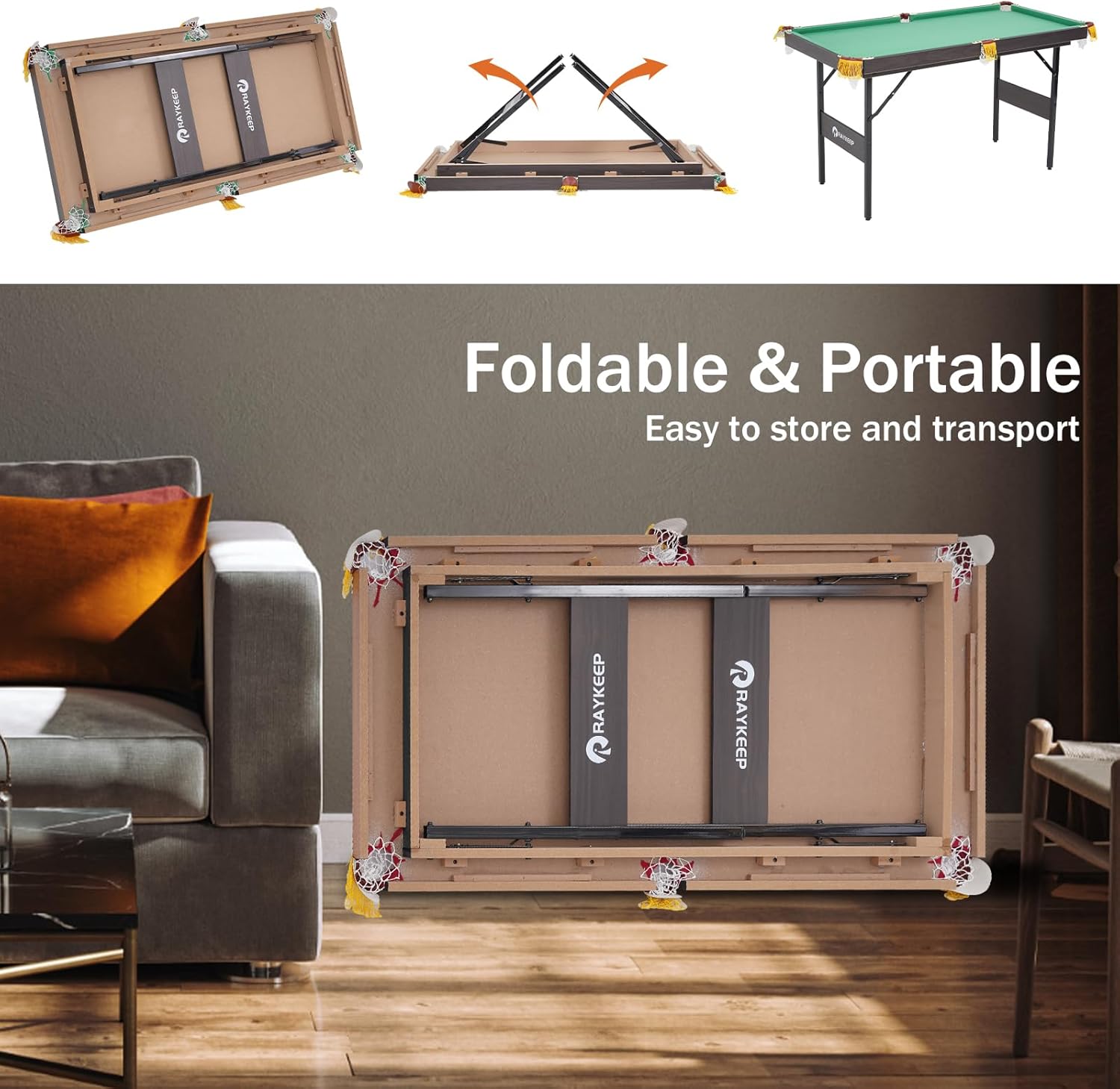 - 【FOLDABLE TABLE LEGS】the rectangular small pool table adopts a space-saving design, pool table legs can be folded quickly for easy carrying and storage. You can store it with a flat surface under the bed or lean against the wall. It is great for use in any basement, children's adult playroom or any corner.