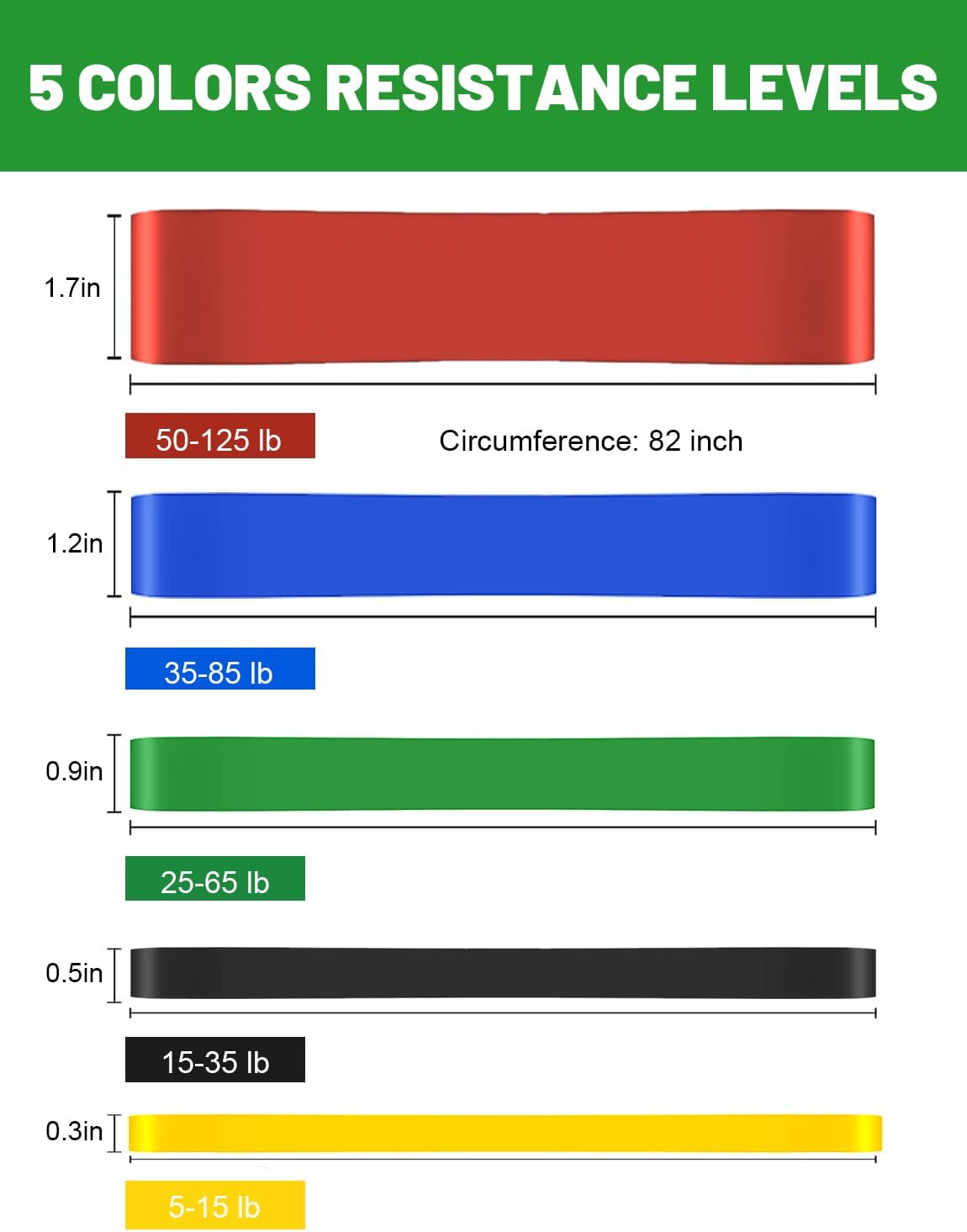 - Package Included: 5 pull up bands, 1 carrying bag and 1 workout guide. Resistance bands are 8-15 lbs, 15-35 lbs, 25-65 lbs, 35-85 lbs, 50-125 lbs. Use these exercise bands to perform rows, pulls, raises, and fly workout sets to exercise your arms, back, hips, legs, chest, and abdominal region
