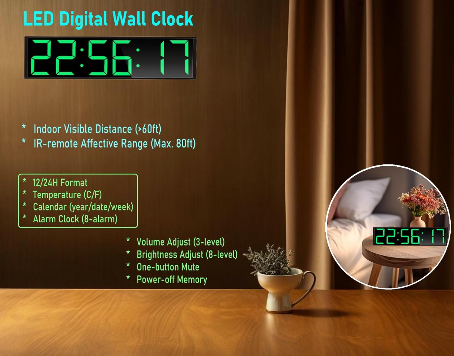 26'' Extra Large Home Gym Timer Clock, Programable Workout Interval Timer, Digital Wall Clock, with 7-Color Night Light, 8 Alarm Clocks, Calendar/Temperature, Countdown & Stopwatch (Green)