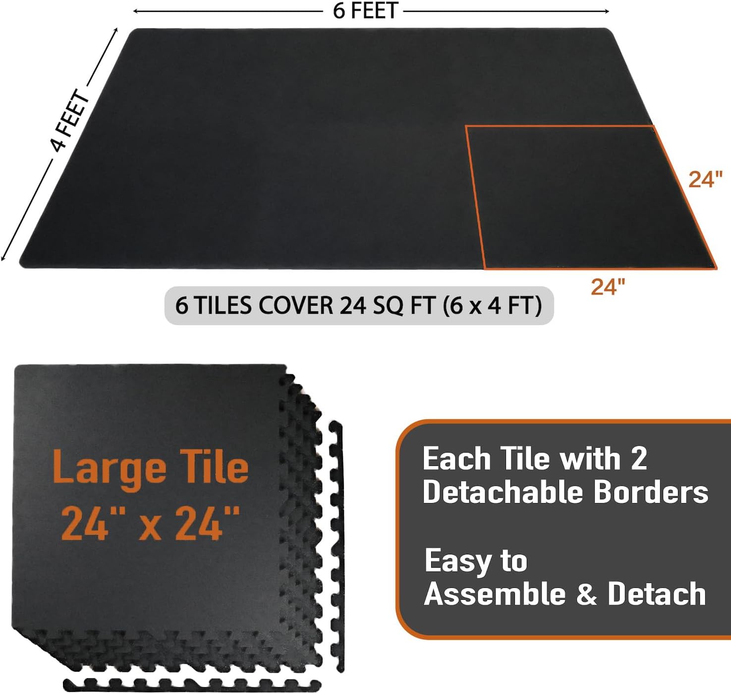 - [Easy to Assemble and Detach]: 6 tiles (24" x 24" x 0.56" each), covers 24 sq ft (6 × 4 ft). Upgraded larger interlocking locks provide a secure fit, preventing any separation during use, ensuring you can work out without concerns of shifting. Simple assembly and detachment make it effortless to set up your home gym.