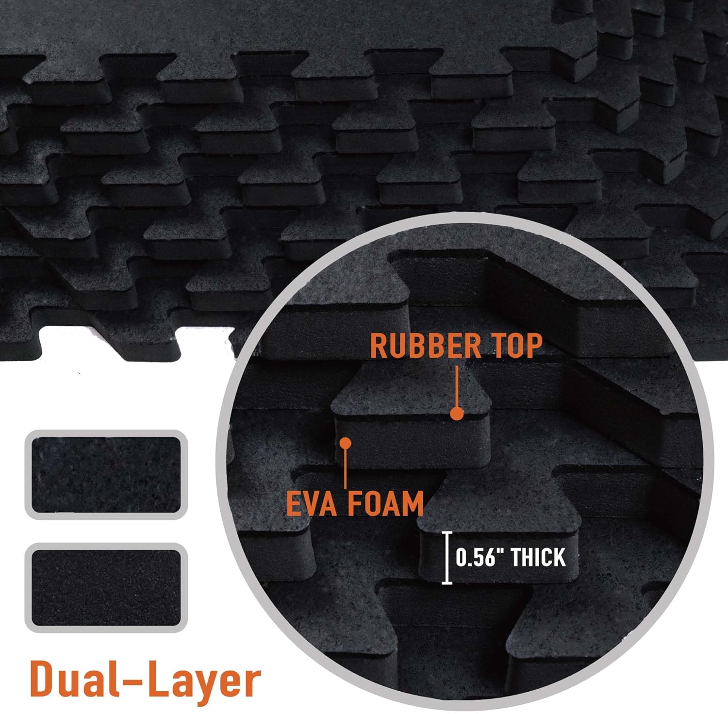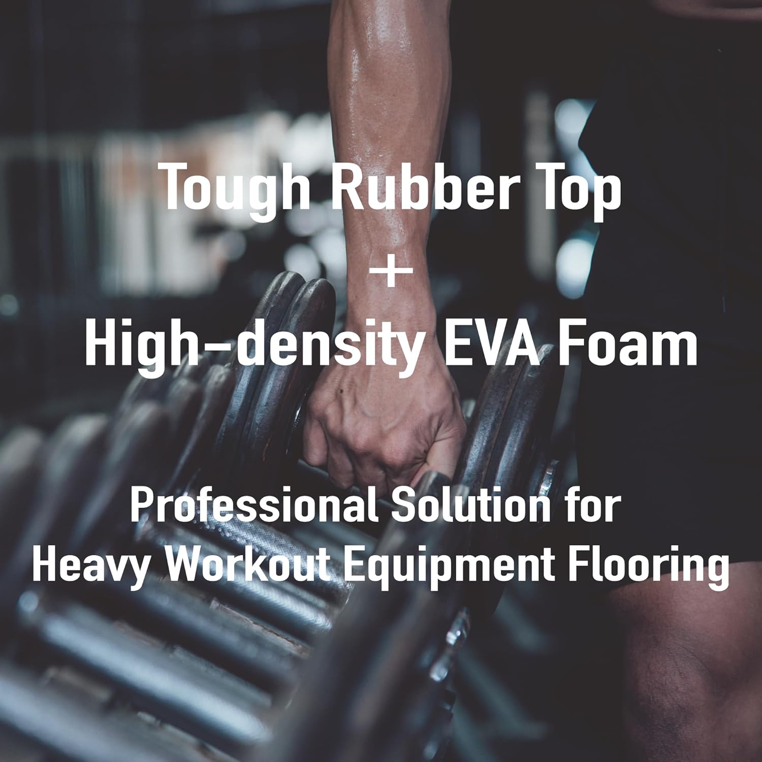- [Upgraded Dual-Layer Design]: Concerned about your equipment scratching the floor during workouts? Our 2in1 Rubber Top EVA Foam Exercise Gym Mats are crafted to solve this issue. The textured rubber top layer, combined with a high-density EVA foam bottom layer, seamlessly creates a non-slip tough surface with excellent shock absorption.