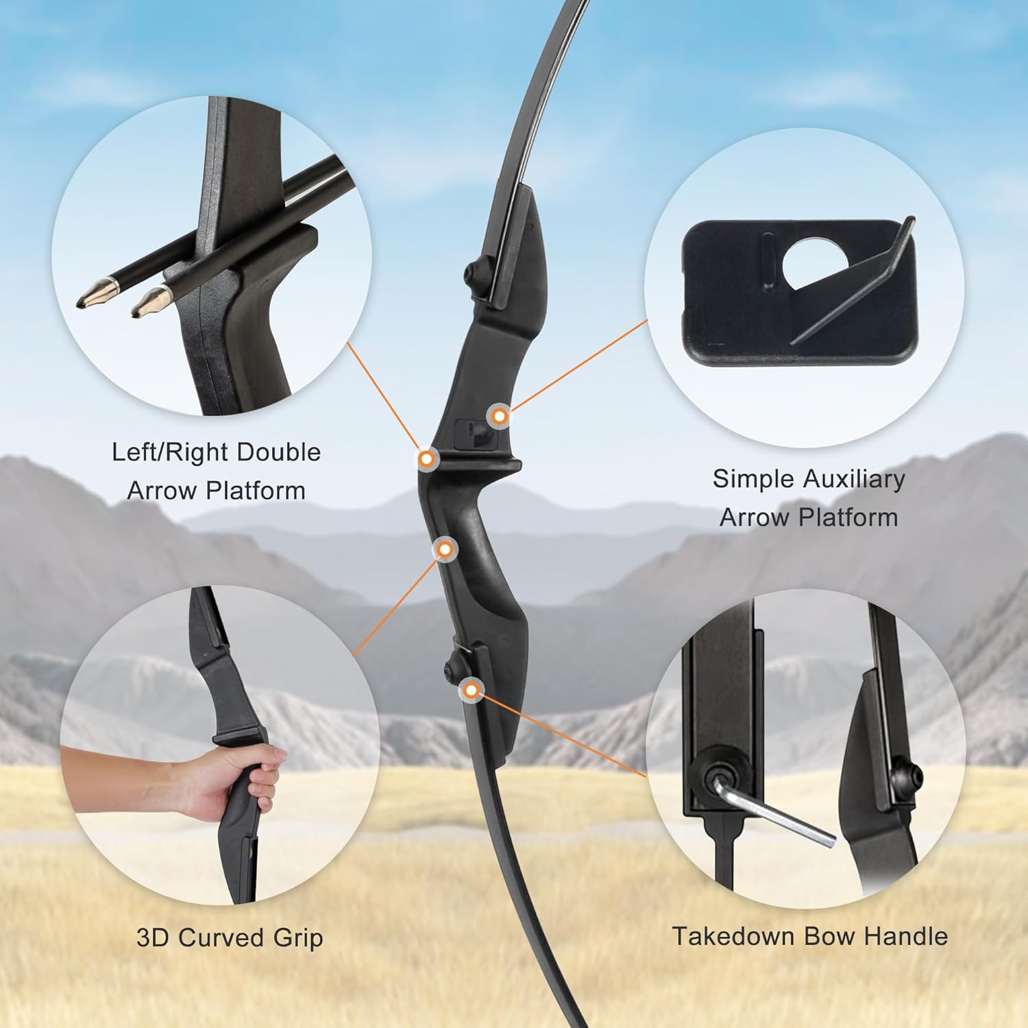 - Package contents:Takedown recurve bow *1, broadheads*3, arrows*12, target paper*6, arrow finger guard*1, left and right arrow rests*1, Product Installation Instructions*1