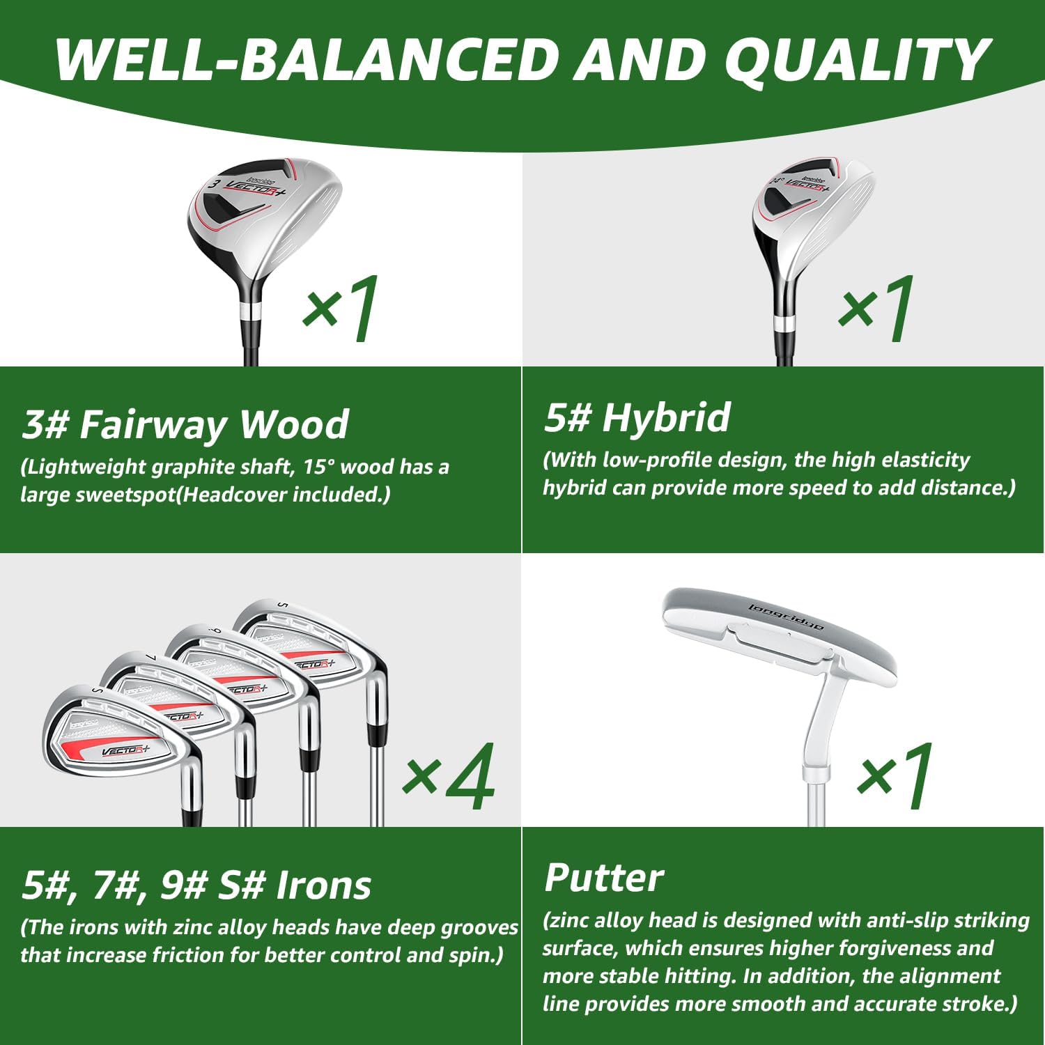 - Convenient Hybrid & Irons: With low-profile design, the high elasticity hybrid can provide more speed to add distance. Besides, the irons with zinc alloy heads have deep grooves that increase friction for better control and spin. By the way, the hybrid is a great alternative for irons