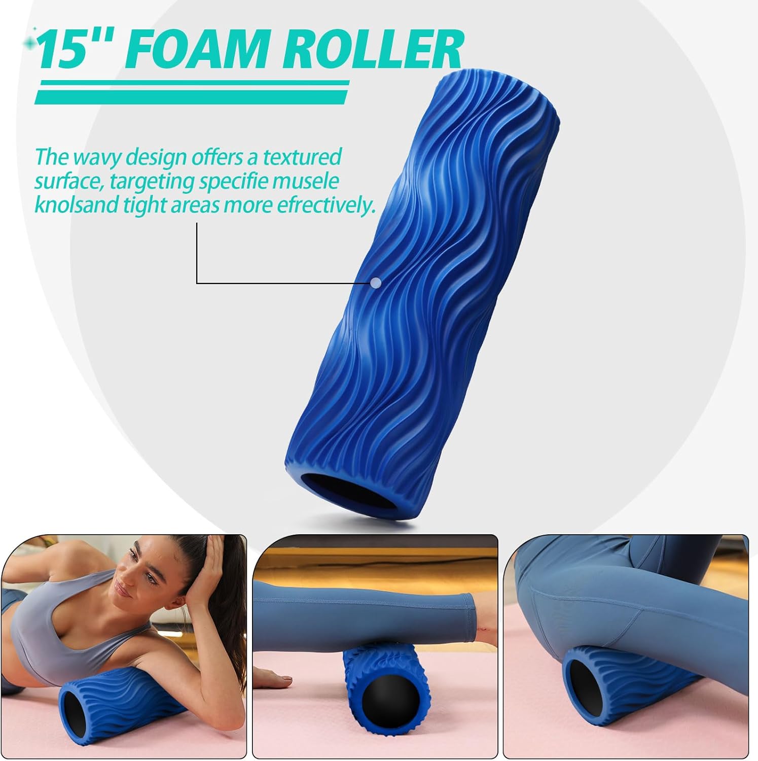 5-in-1 Foam Roller Set, Massage Roller Stick, Massage Ball, Resistance Band for Deep Muscle Massage, Trigger Point Release, Pilates, Yoga (Blue-Wave)