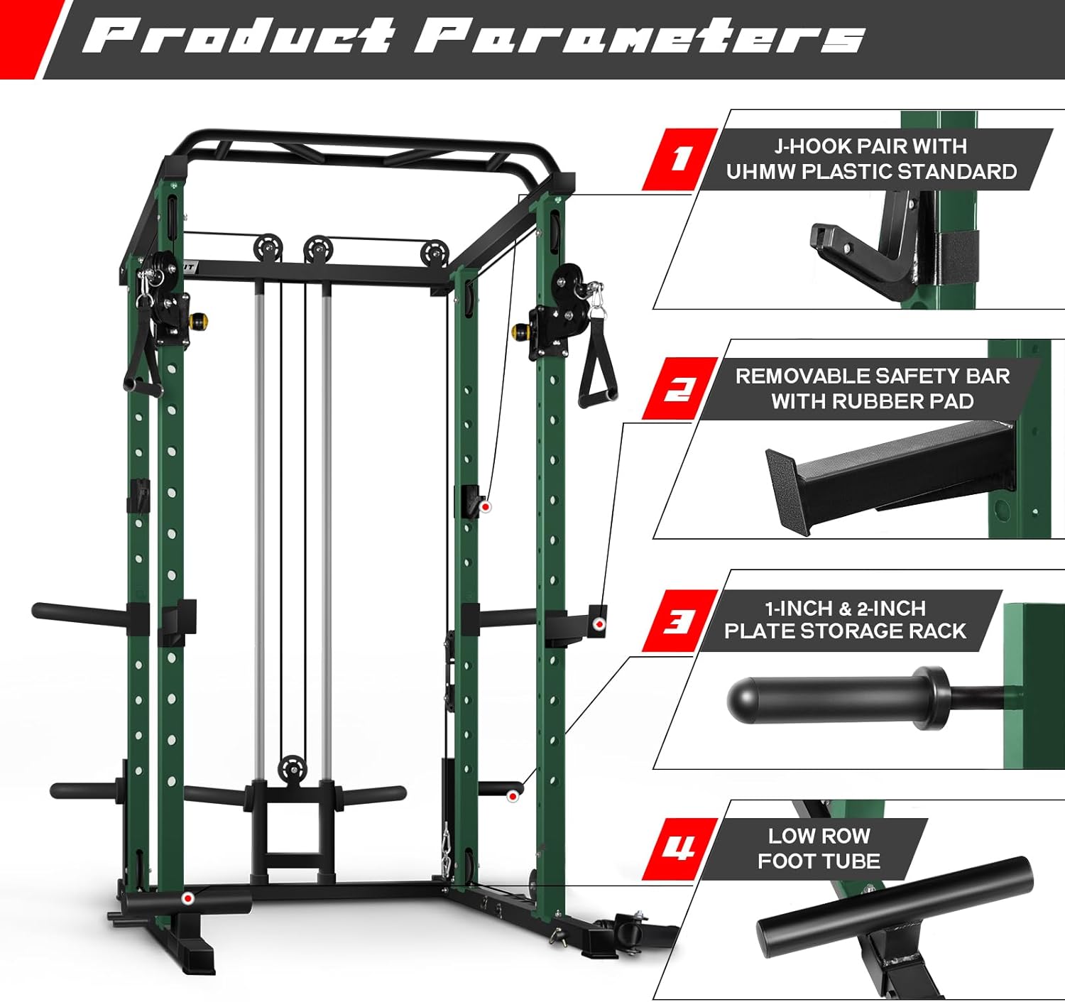 - Free Utility Machine Attachments - The workout cage comes with a complete set of 20+ attachments, including 2 x J hooks, 2 x Safety Spotter Arms, 2 x Cable Grip Handles, 1 x Lat Pulldown Bar, 1 x Row Bar, 1 x Row Low Foot Tube, 1 x 360Β° Landmine, 4 x Plate Storage Pins, 2 x Weight Holers for the Cable System, 4 x band pegs, as well as 1 x Multi-grip Pull Up Bar. These attachments meet all your needs for various workouts