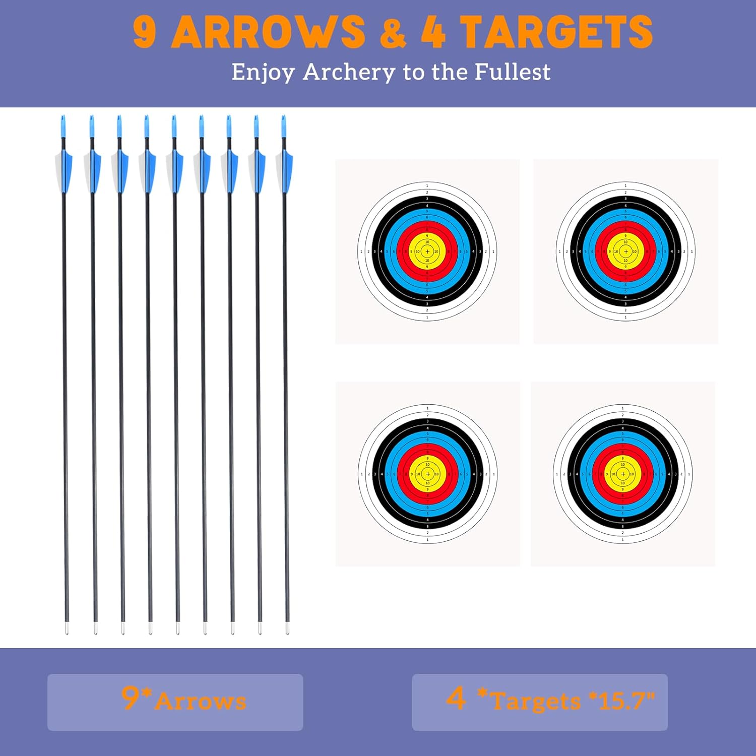 - 【Complete Archery Set】: Includes 1 compound bow, 9 safety fiberglass arrows, 4 target faces, 4 pins for target setup, 1 arm guard, 1 arrow quiver, and a pin sight for precision aiming. Everything needed for a fantastic archery adventure, ideal for kids bow and arrow set.