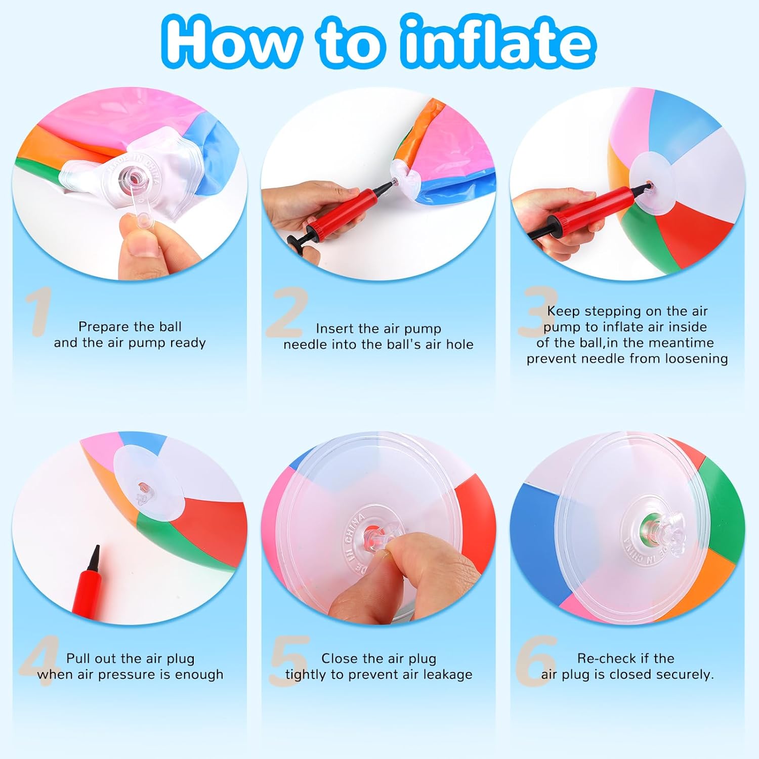 - Easy to inflate:The beach balls for pool come deflated which is very convenient for travelling,you can easily inflate them by mouth or air pump.With tight valve design,once inflated,and valve closed,air won’t leak;