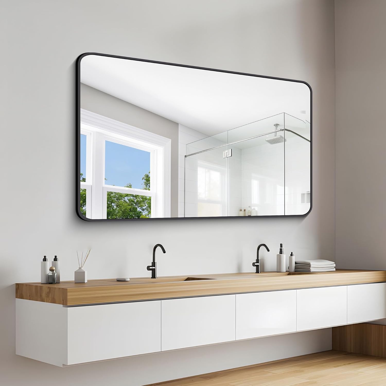 - [4mm HD Shatterproof Glass]:Our bathroom wall mirrors use multi-layer advanced technology, bathroom vanity mirrors are made of HD glass. The mirror reflects clearly and will not be distorted from any angle.