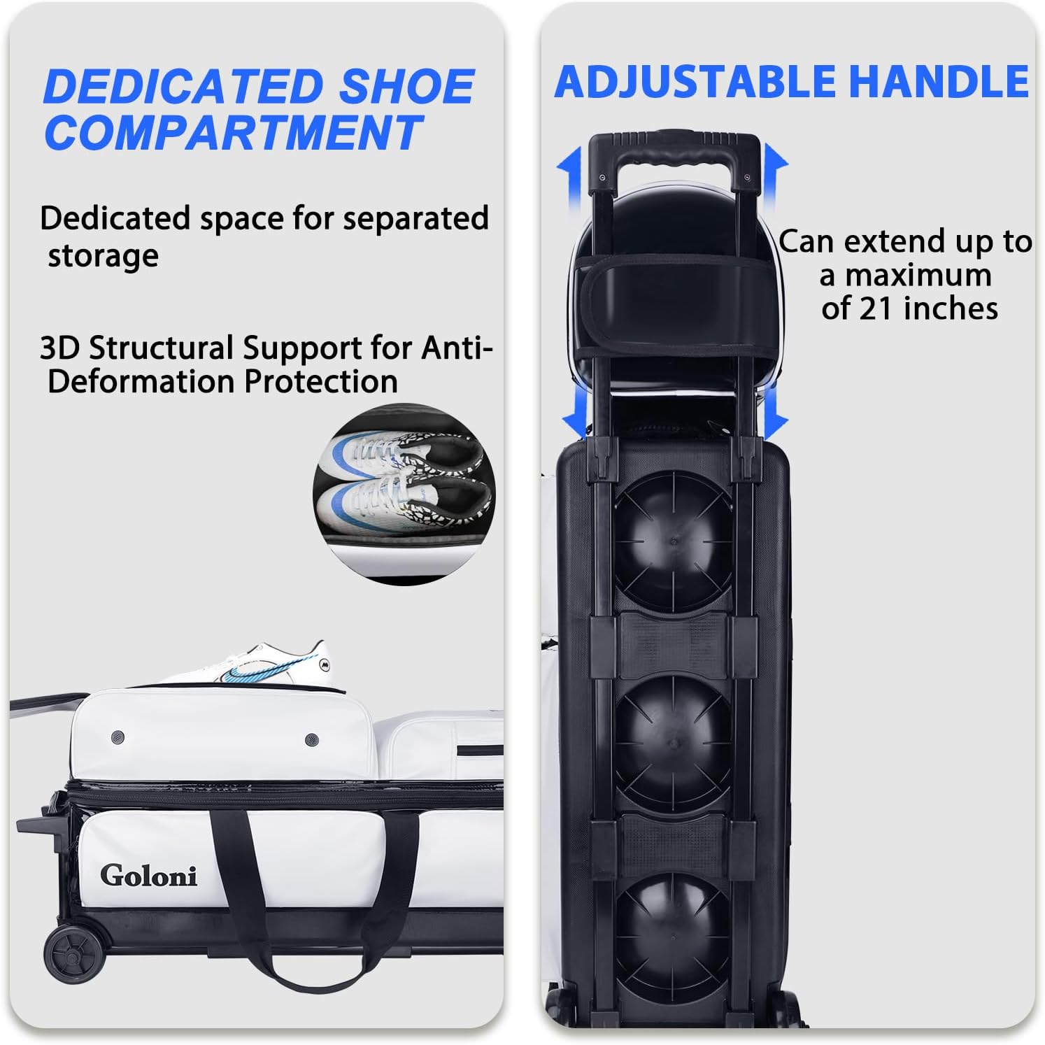 - Large-Capacity Storage:This bowling bag combines a 3-ball rolling bag with wheels and a 1-ball matching add-on tote, effortlessly storing 4 bowling balls. The separate shoe compartment can hold a pair of men's size 16 bowling shoes. Additionally, there are multiple pockets that can store other bowling accessories