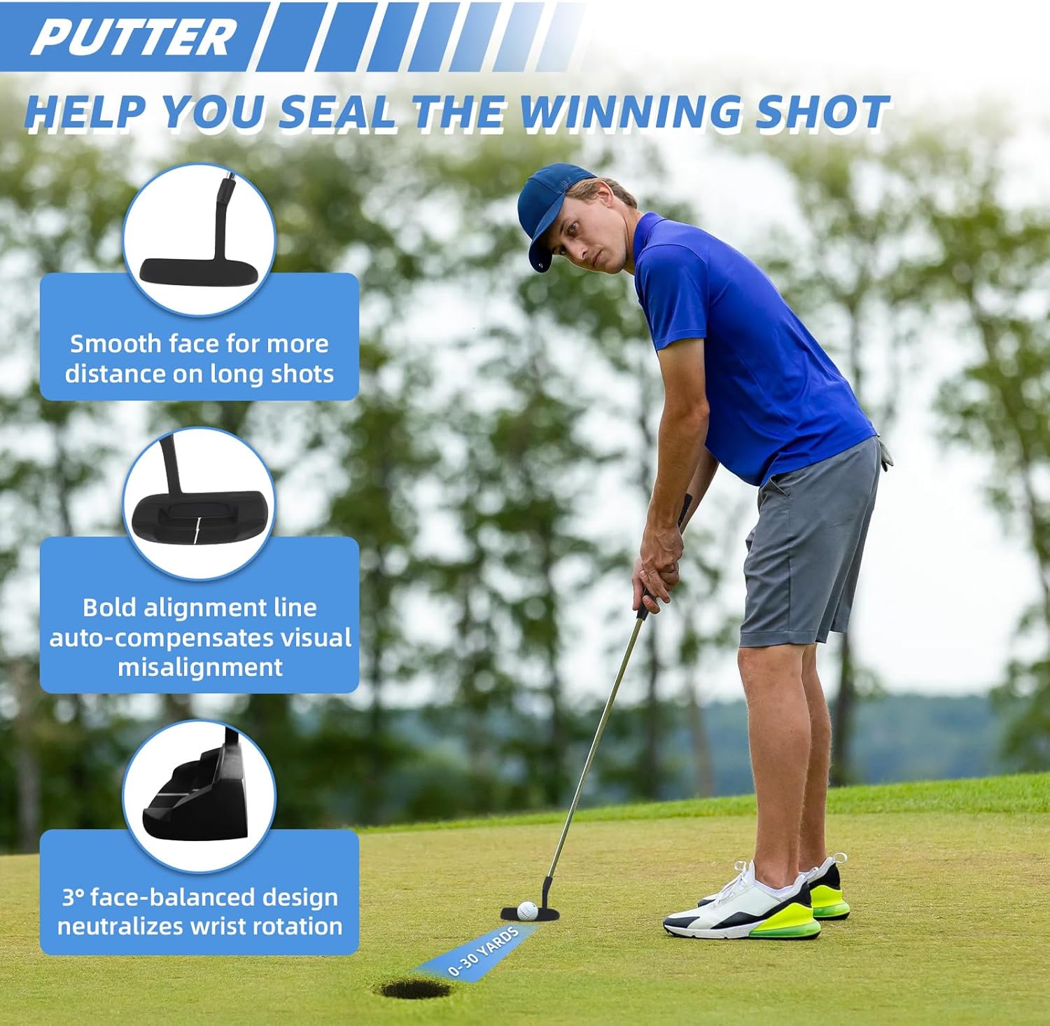 - Premium & Precise Putter: The precise putter with zinc alloy head is designed with anti-slip striking surface, which ensures higher forgiveness and more stable hitting. In addition, the alignment line provides more smooth and accurate stroke