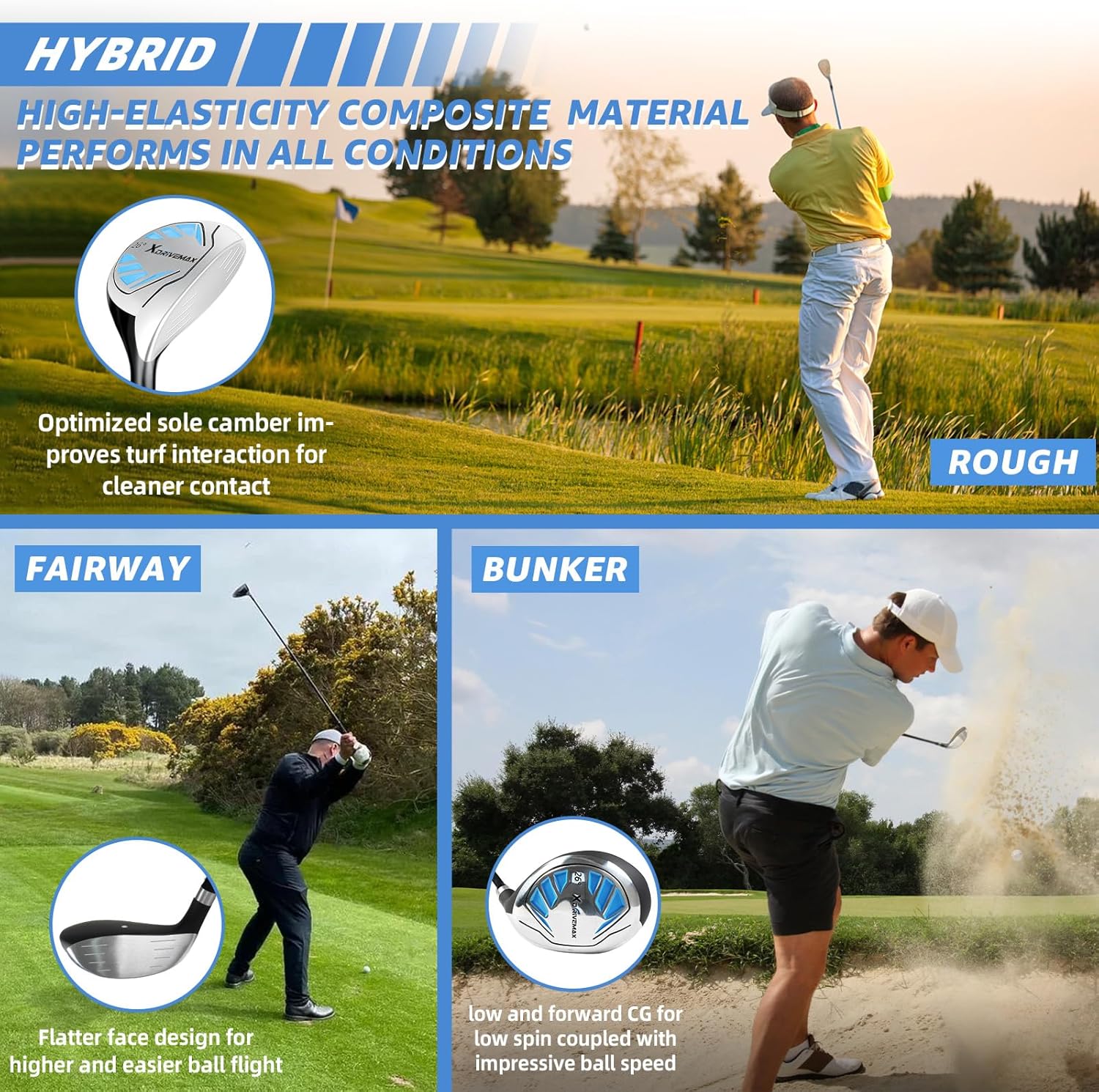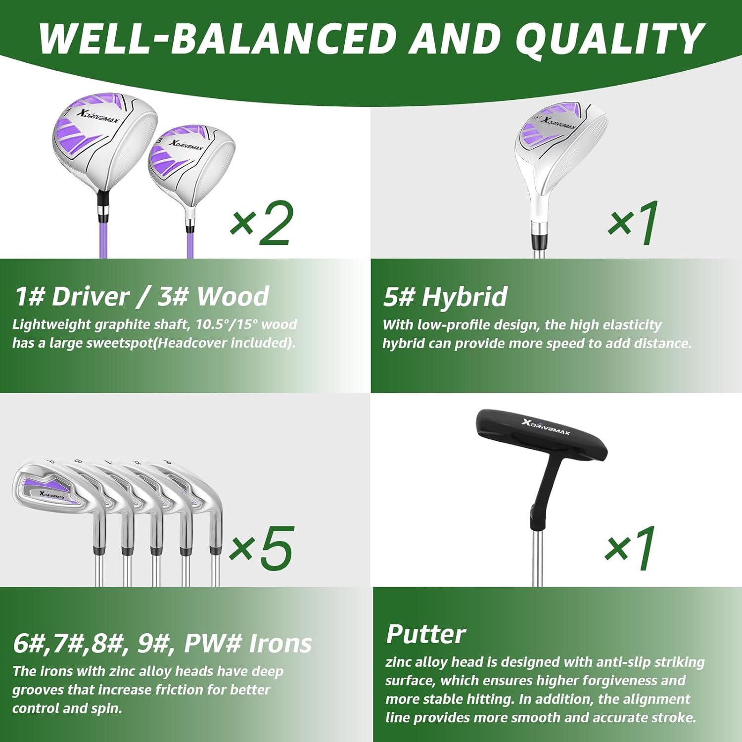 - Convenient Hybrid & Irons: With low-profile design, the high elasticity hybrid can provide more speed to add distance. Besides, the irons with zinc alloy heads have deep grooves that increase friction for better control and spin. By the way, the hybrid is a great alternative for irons