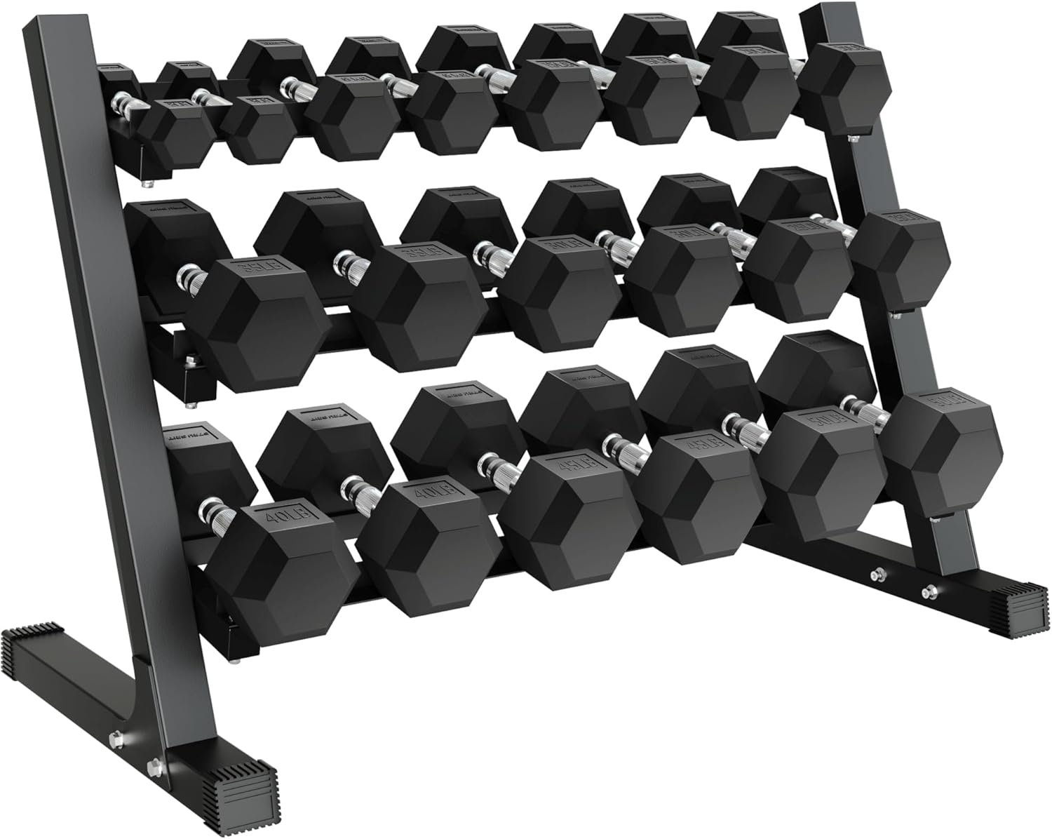 - 【Compact, Anti-Roll Storage Rack】: The sturdy 3-tier rack organizes weights efficiently with hex-shaped slots to prevent rolling. Its angled, non-slip design ensures quick access and maximizes floor space, perfect for apartments or home gyms.