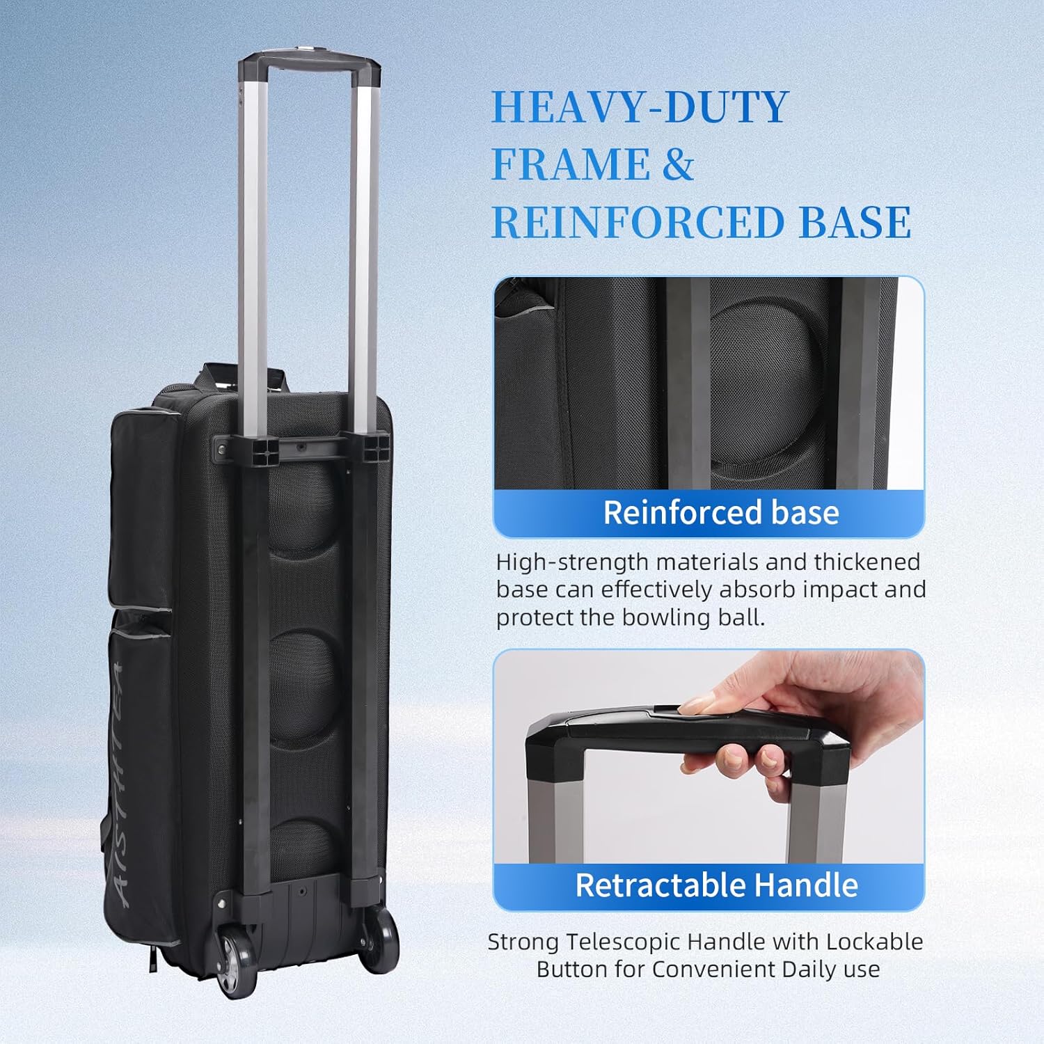 - ▶Convenient to Carry - The bowling bag equipped with adjustable padded shoulder straps and padded handles, providing a comfortable carrying experience. the premium retractable handle (with button lock) can extend up to 41’’(105cm) for desired height and easy transportation.