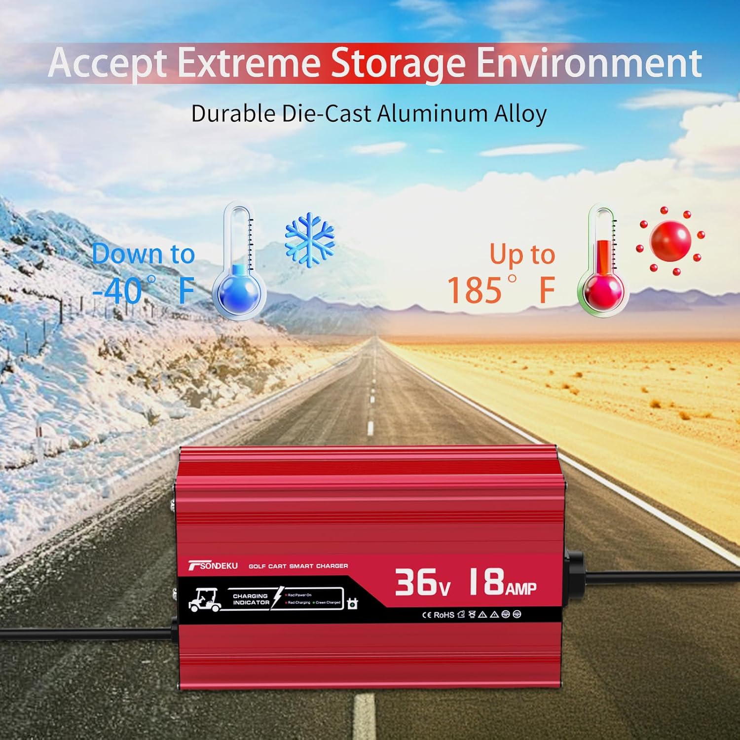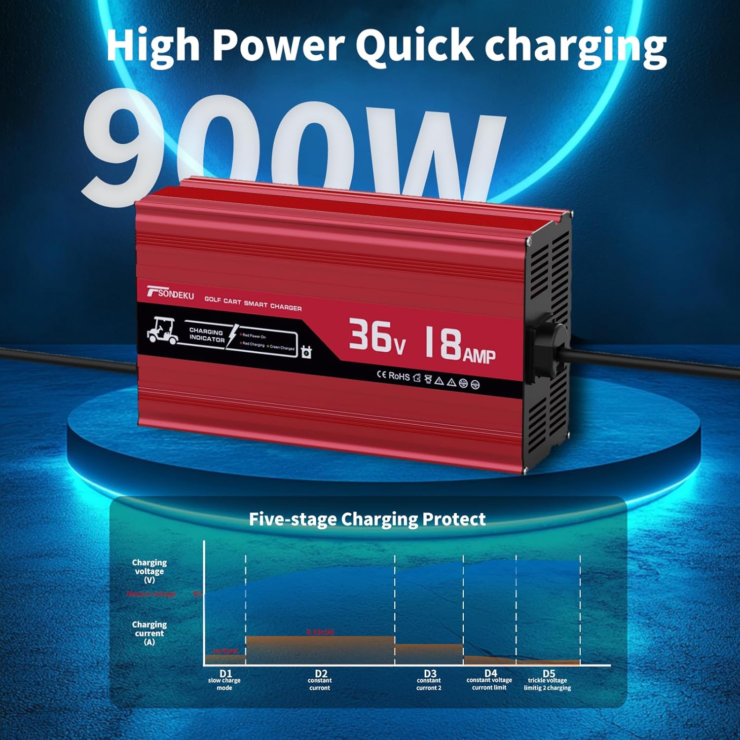 - Durable Design: The Stylish Deep Red Aluminum Shell Not Only Enhances The Aesthetic Appeal But Also Provides Robust Protection. This 36v Golf Cart Charger Is Built To Last, Making It A Perfect Accessory For Both New And Used Golf Carts For Sale. Its Durable Construction Ensures Long-Term Reliability And Performance.