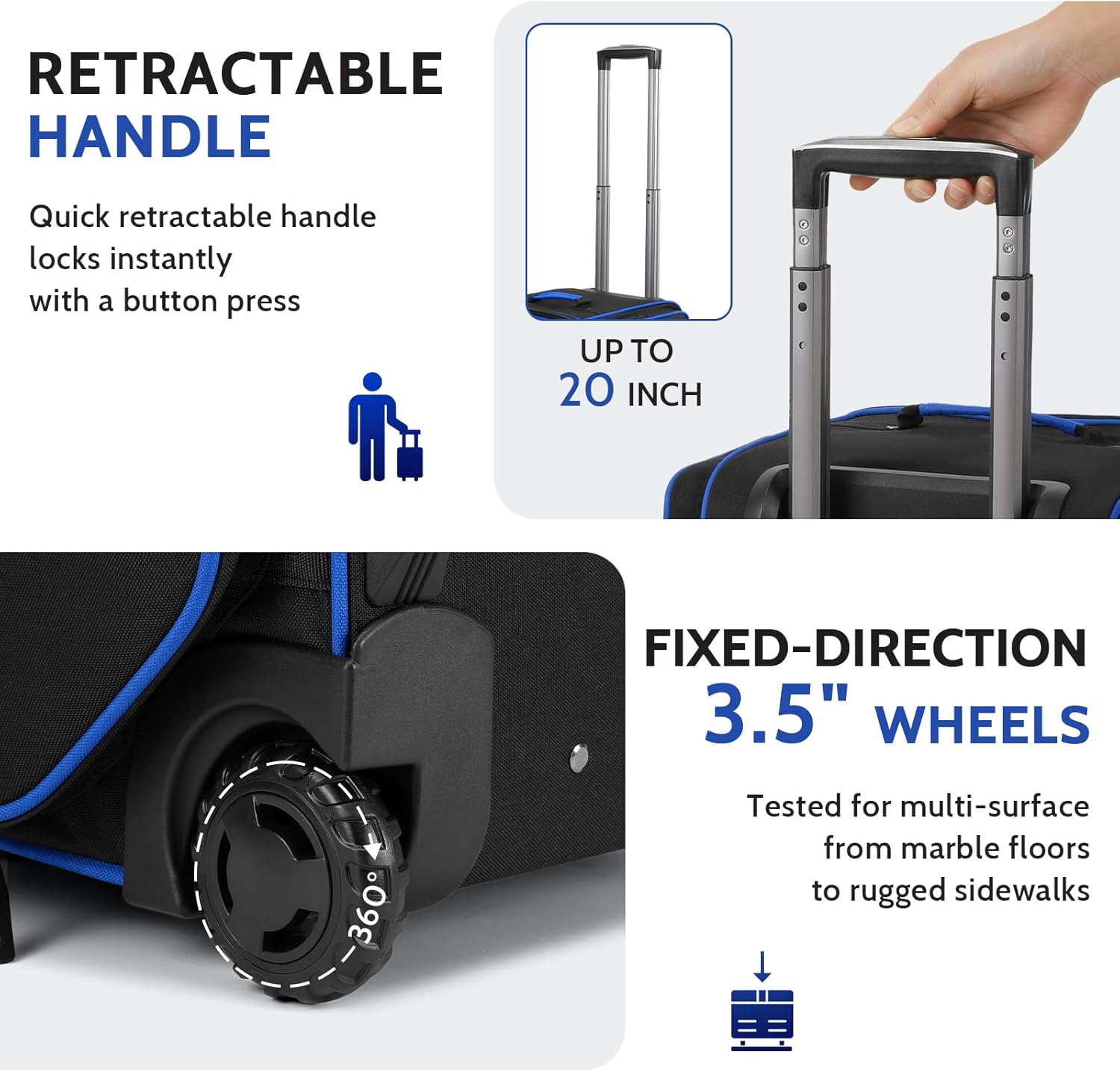 - Smooth-Rolling 3.5" Wheels: Our 3 ball bowling bags with wheels can glides effortlessly on any terrain without tipping with 360° maneuverability and anti-tip wheels. Adjustable telescopic handle (extends to 20") ensures comfort for all users.