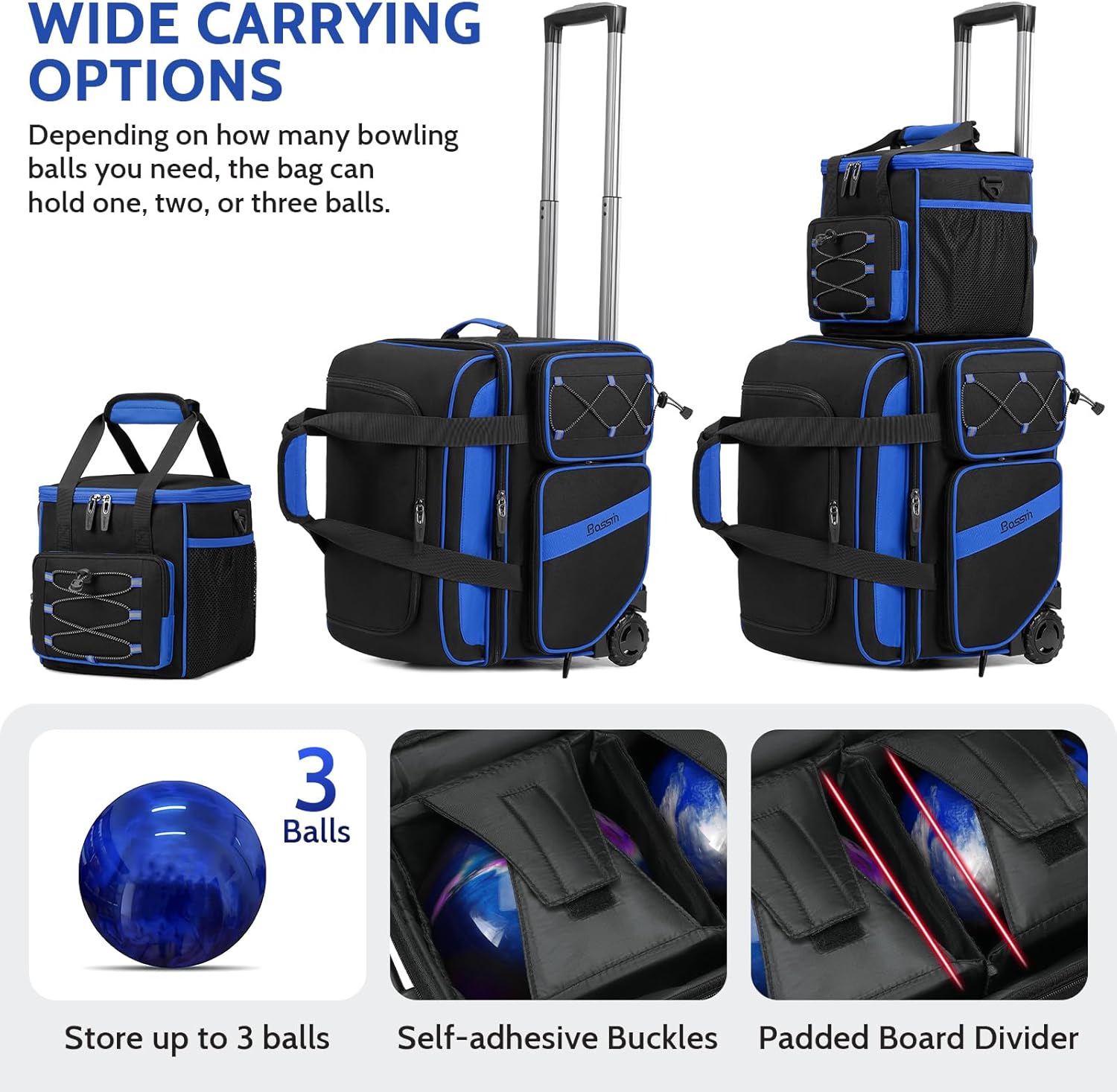- Versatile 3 Ball Bowling Bag: This 2 ball bowling bag with wheels plus 1 ball single bag combo adapts to your needs—carry 1, 2, or 3 balls plus bowling accessories. Ideal for pros who need versatility or beginners scaling up their gear.