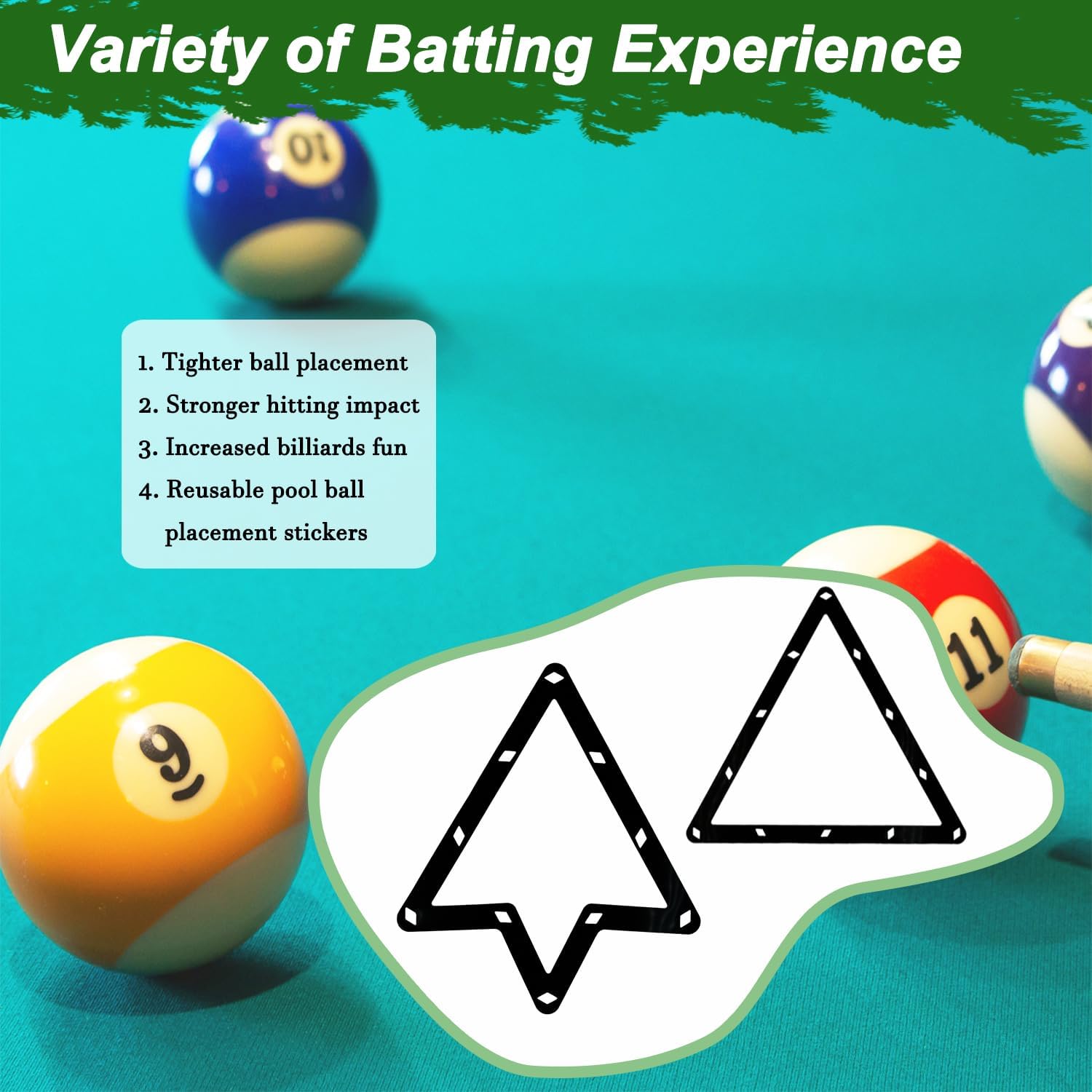 - 【WHAT YOU GET?】: Our wooden pool ball rack set includes: wooden pool triangle rack*1, wooden diamond pool 9 ball rack*1, billiard pendulum stickers*2, pool table clean brush*2, pool chalks*12, cleaning towel*1, pool table repair sheet*1, positioning sticker*1, acrylic chalk holder*2, meet all your needs.