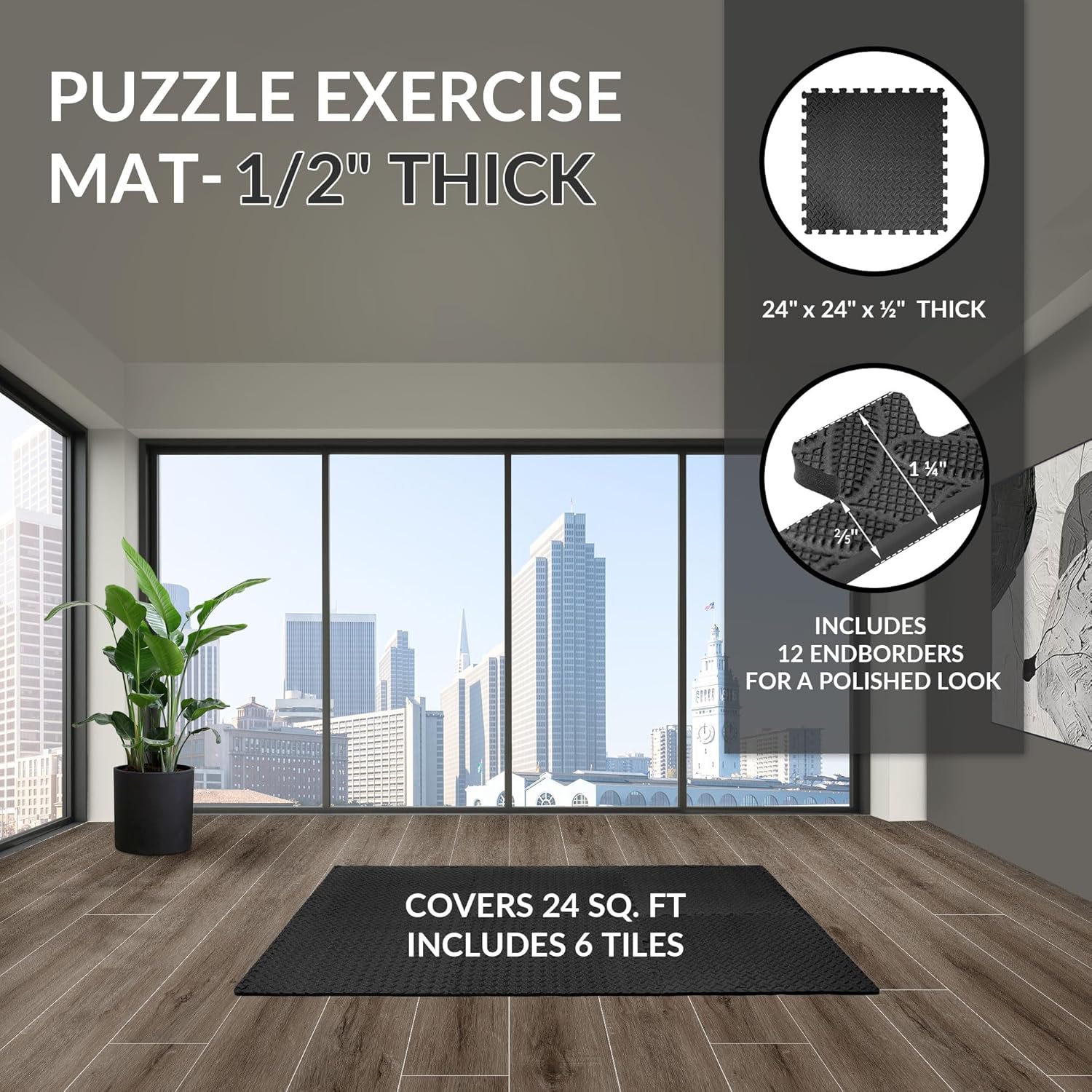 - Quick-Connect Interlocking Tiles for Effortless Setup: Assemble your home gym flooring in minutes! 6 tiles, each 24β x 24β x 0.5β puzzle exercise mat clicks together seamlessly with reinforced edges, and the included border pieces create a polished finish. Disassemble just as fast for compact storage