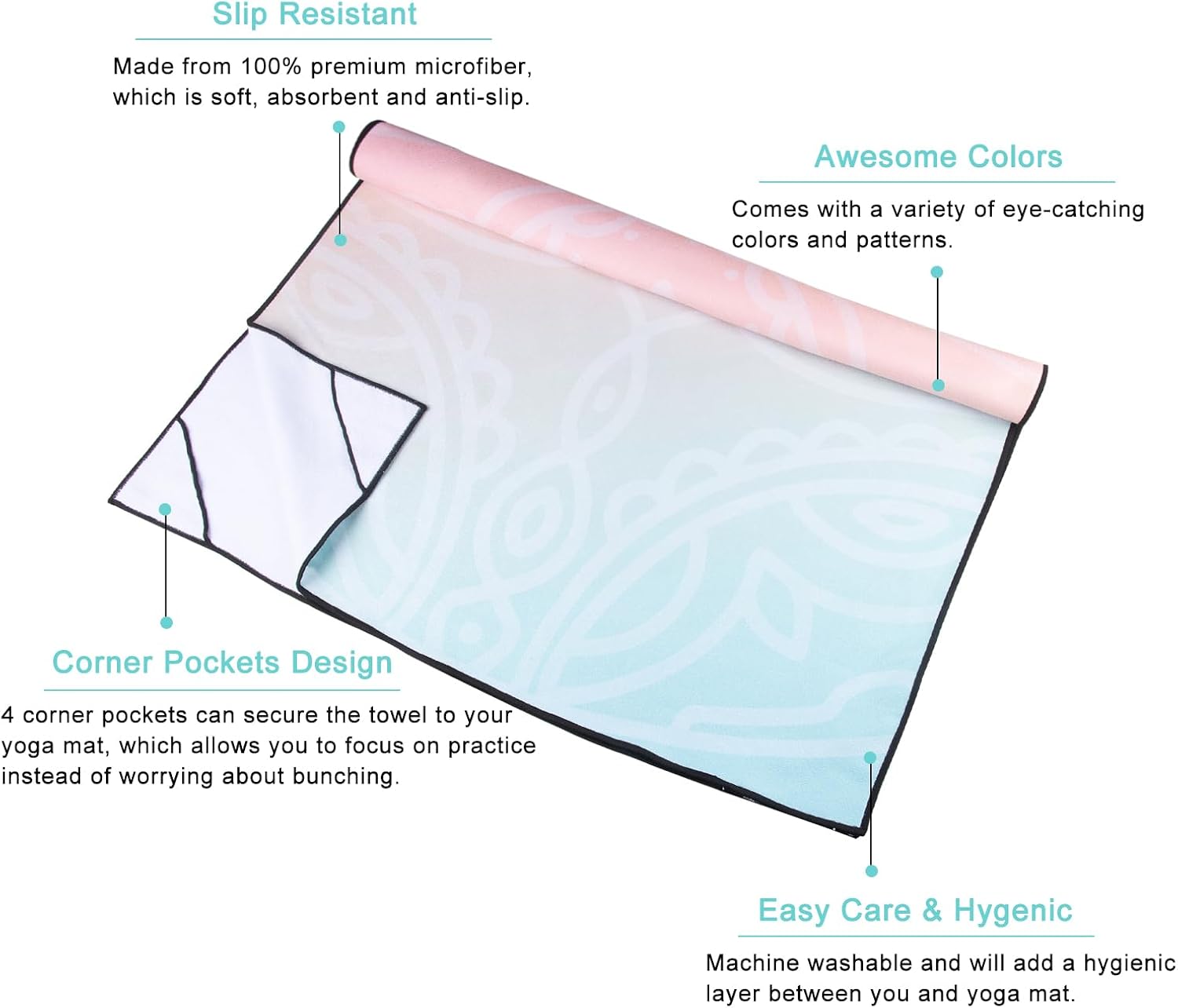 - Corner Pockets Design: Features 4 corner pockets on the backside, the non slip yoga mat towel helps secure and hold onto the mat firmly. This allows you to focus your mind, body and breath on the yoga practice, without worrying about bunching.