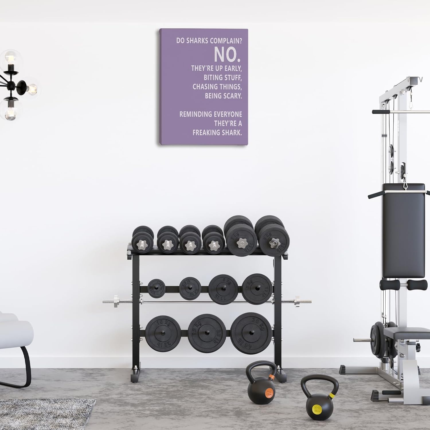 Rusenbao Gym Motivational Workout Wall Art, Home Gym Decor, Inspirational Workout Room Decor, Do Sharks Complain About Monday, Canvas Wall Art for Exercise Fitness Room Office, 11x14 inch(Purple)